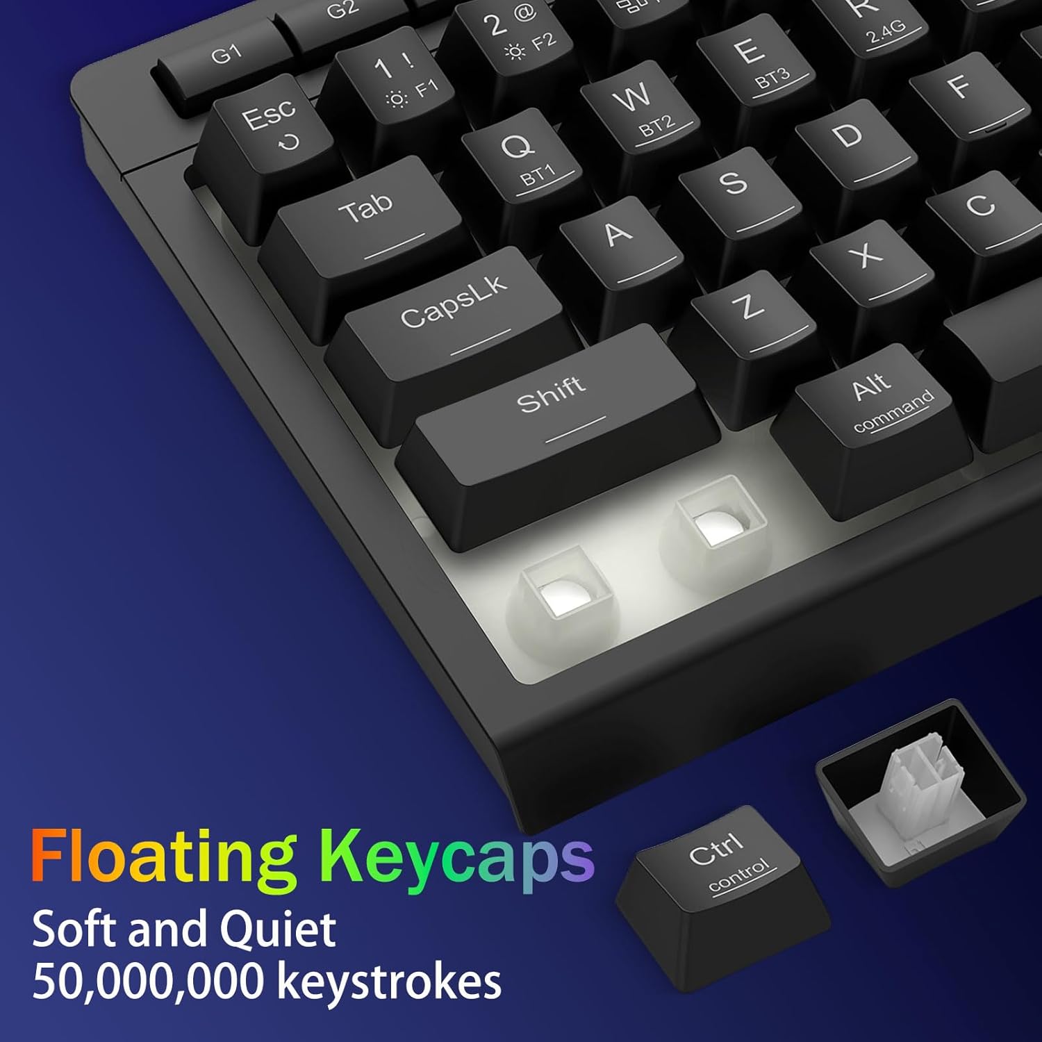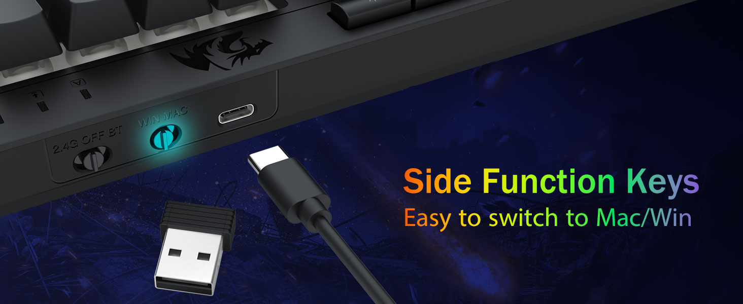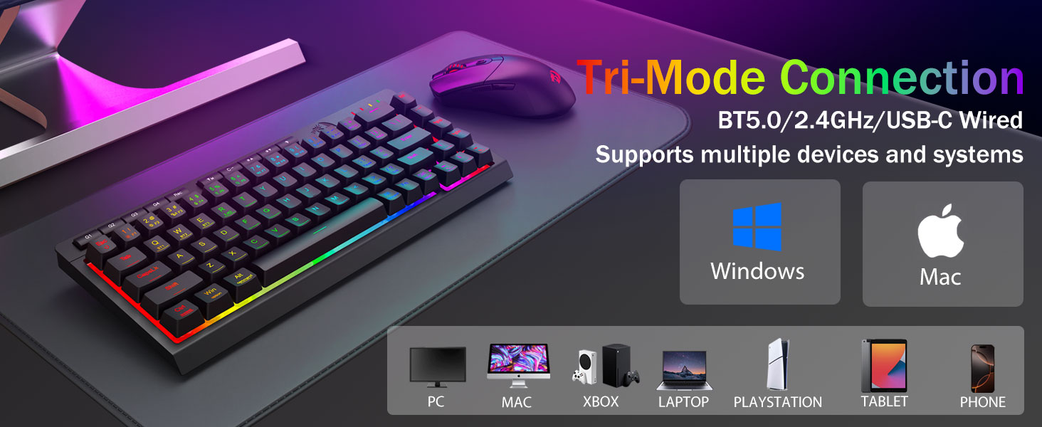 Versatilidad trimodal y dominio de múltiples dispositivos:Cambie sin problemas entre los modos Bluetooth 5.0, inalámbrico de 2,4 GHz o USB-C con cable, conectando hasta 5 dispositivos simultáneamente (PC, Mac, tabletas, teléfonos, PS/XBOX). Alterne dispositivos sin esfuerzo mediante teclas de acceso directo o botones laterales, perfecto para configuraciones híbridas de trabajo y juegos. Manténgase encendido durante semanas con la batería de 4000 mAh (más de 30 días en espera, 50 horas de funcionamiento RGB).