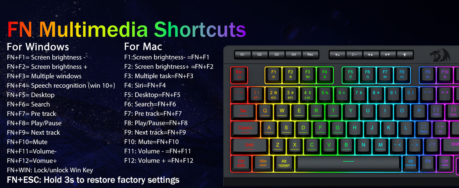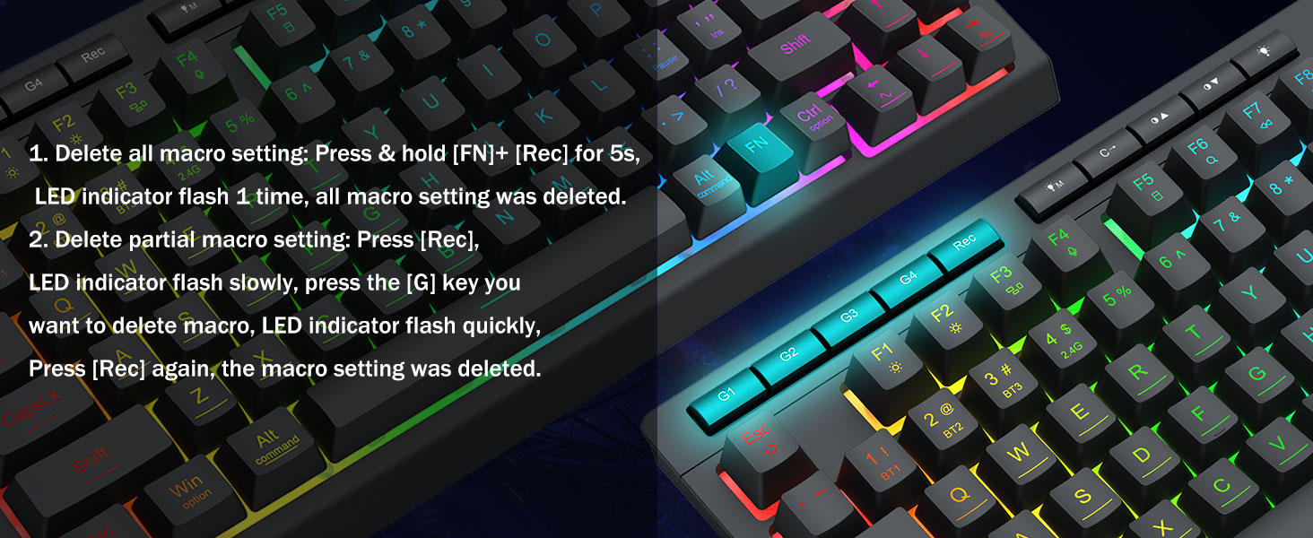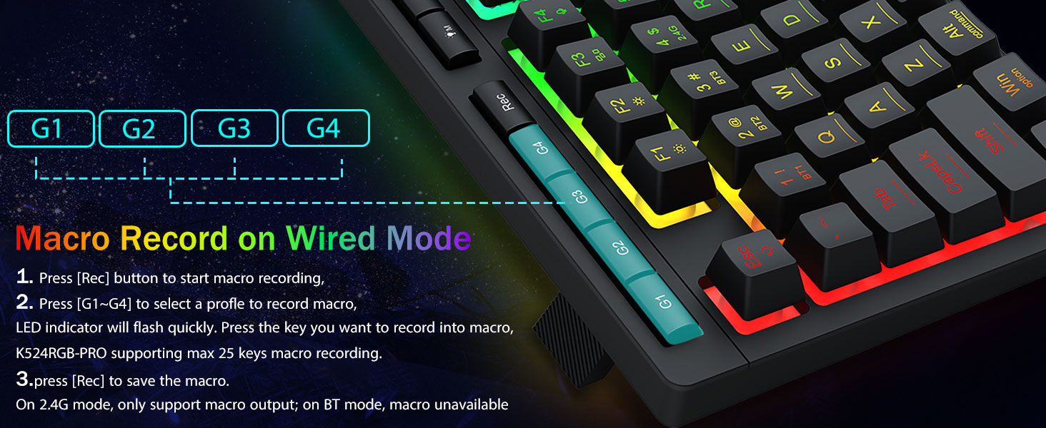 Macros personalizables, control sin esfuerzo- Programe las 4 teclas macro integradas (G1-G4) al instante, no se requiere software. Graba combinaciones complejas para juegos, atajos para productividad o comandos multimedia. Redefina su flujo de trabajo en segundos. También puede utilizar software para personalizar funciones, crear macros, ajustar luces RGB y establecer atajos.