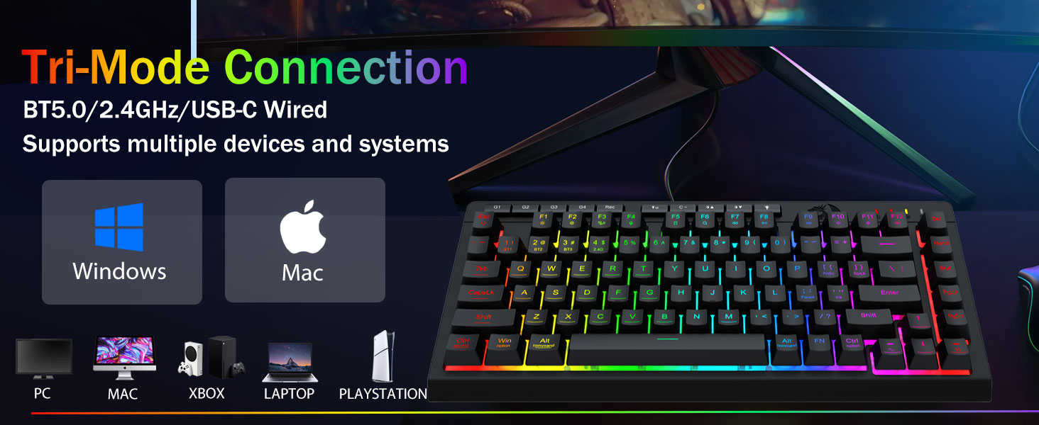 Versatilidad trimodal y dominio de múltiples dispositivos- Cambie sin problemas entre los modos Bluetooth 5.0, inalámbrico de 2,4 GHz o USB-C con cable, conectando hasta 5 dispositivos simultáneamente (PC, Mac, tabletas, teléfonos, PS/XBOX).
