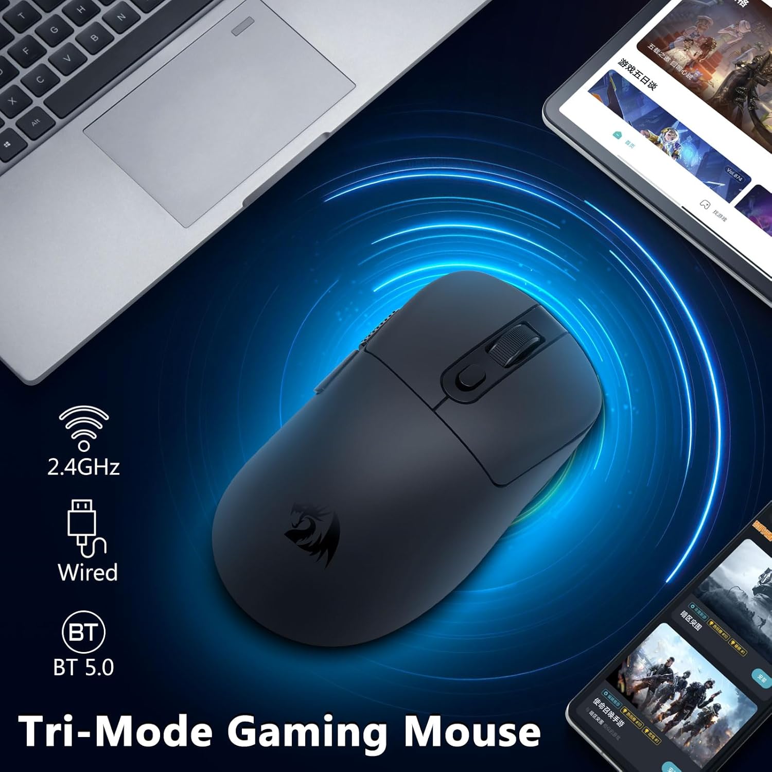 El mouse para juegos CHUANGQUAN Black M818 inalámbrico de 24,000 DPI, trimodo 2.4G ofrece seguimiento preciso, conectividad flexible y control suave, ideal para jugadores y profesionales que buscan velocidad, precisión y rendimiento multidispositivo perfecto.