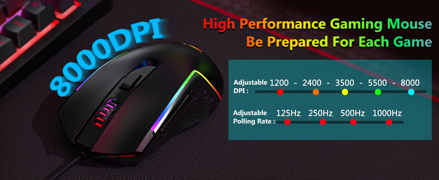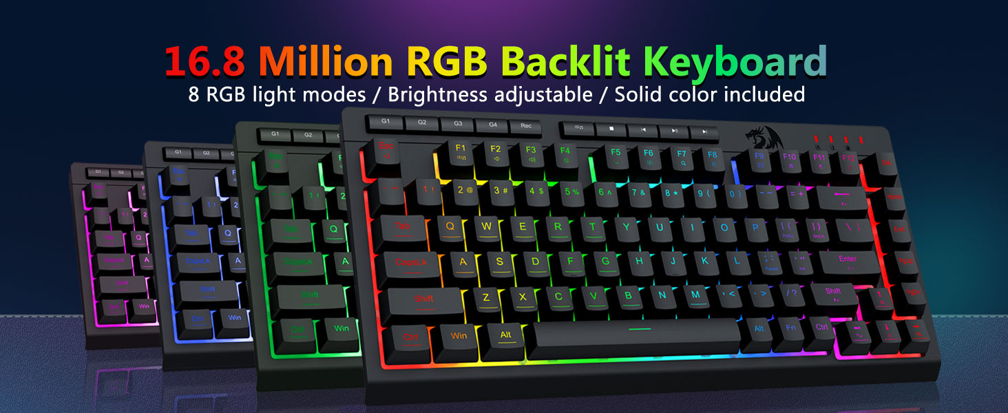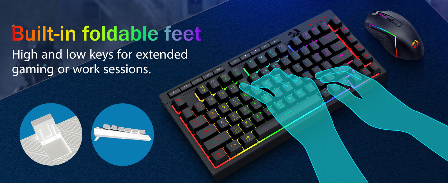 【Teclado y mouse para juegos RGB】El teclado para juegos tiene 8 modos de iluminación RGB para elegir y el mouse para juegos tiene 8 efectos de iluminación para alternar, y el teclado se puede ajustar en 4 niveles de velocidad y brillo para adaptarse a sus preferencias. Las teclas ofrecen una retroiluminación clara y uniforme. Ya sea que el conjunto tenga una sola luz, efectos de luz cambiantes o ninguna luz, ¡el teclado y mouse para juegos Redragon satisfarán tus necesidades!