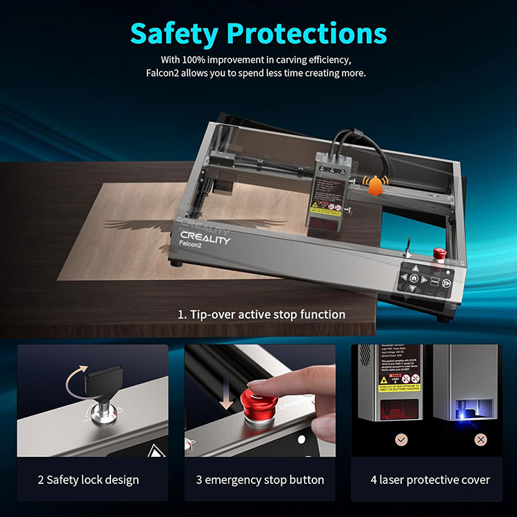 · Cinco protecciones de seguridad:Interruptor de límite bidireccional. Si la cabeza láser golpea el límite, se detendrá automáticamente y un timbre. Función de parada activa. El grabado con láser dejará de funcionar en caso de inclinación accidental, voltea o cae con el timbre y la alerta de envío del indicador. Diseño de bloqueo de seguridad. Puede hacer solo uso profesional. Botón de parada de emergencia. Un paso para detenerse. Cubierta protectora láser. Hecho de material de vidrio de filtro de color que evitará que el láser deslumbra los ojos.