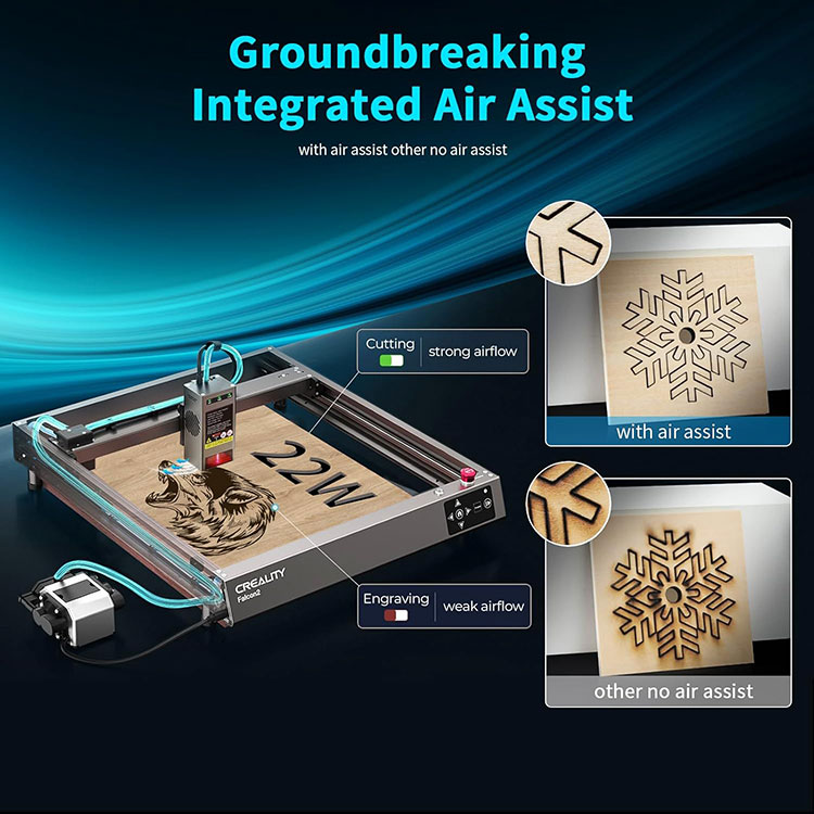 · Asistencia aérea integrada innovadora:Ajuste manualmente la asistencia de aire sin paso a través de la perilla, o puede ajustar automáticamente el flujo de aire a través de Lightburn, para eliminar el humo y proteger la lente láser, trayendo un resultado más limpio.