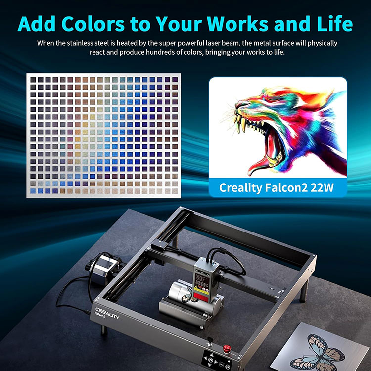 · Trabajo colorido Vida colorida:Cuando el acero inoxidable se calienta por el haz láser súper potente de la máquina de grabado con láser creality, la superficie del metal reaccionará físicamente y producirá cientos de colores, dando vida a sus obras. Uno de su creatividad con creality halcon2.
