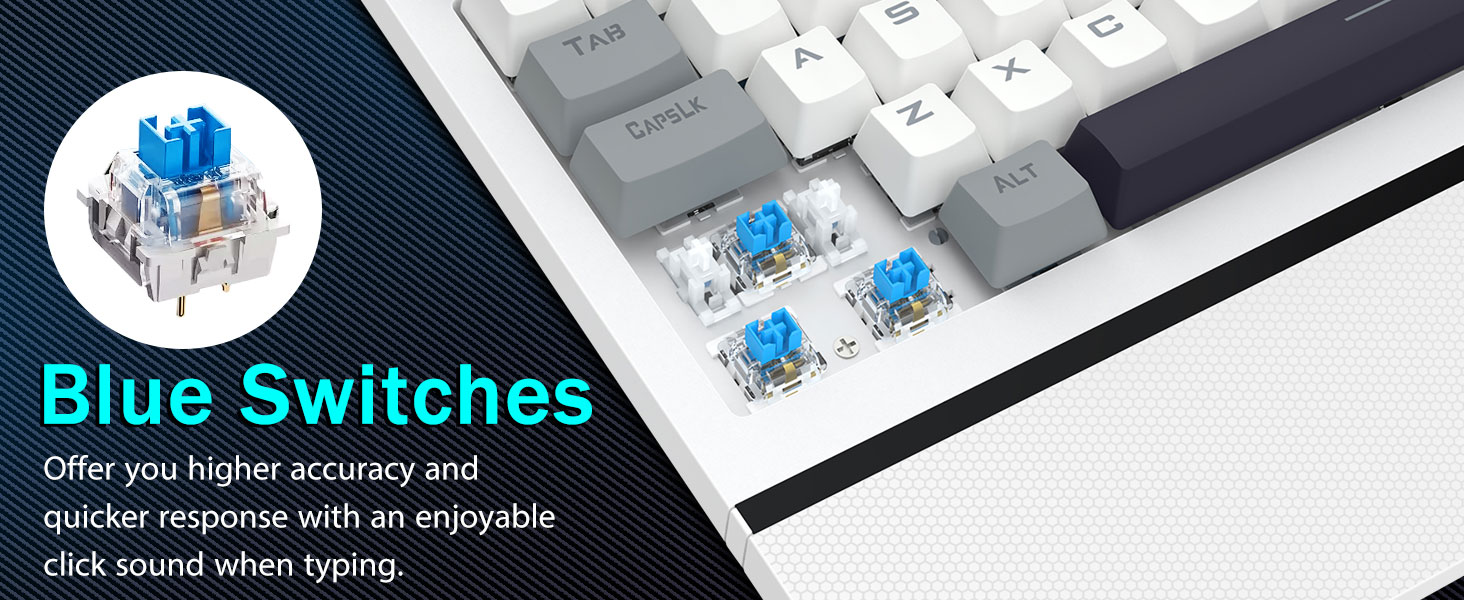 【Interruptores azules receptivos para escritura de precisión】Nuestro teclado para PC cuenta con interruptores azules con clic que brindan tiempos de respuesta ultrarrápidos y una precisión notable. Cada pulsación de tecla produce un sonido de clic satisfactorio, lo que mejora su experiencia de escritura. Con un desplazamiento de teclas más profundo, una respuesta más potente y un espaciado de teclas más amplio, escribir no sólo es más preciso sino también mucho más cómodo. Si eres fanático de esa sensación táctil de "clic", nuestro teclado es la elección perfecta para ti.