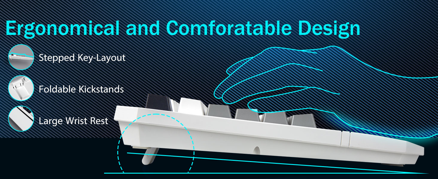 【Ergonomía avanzada para comodidad durante todo el día】Diseñado pensando en su comodidad, nuestro teclado para jugadores de PC presenta un diseño científico de teclas en forma de escalera y un espacioso reposamuñecas. Esta configuración mantiene los brazos en una posición natural, lo que reduce la fatiga de las manos durante el uso prolongado. El teclado con cable también viene con 2 soportes traseros resistentes y plegables, lo que le permite ajustar la inclinación para una postura óptima.