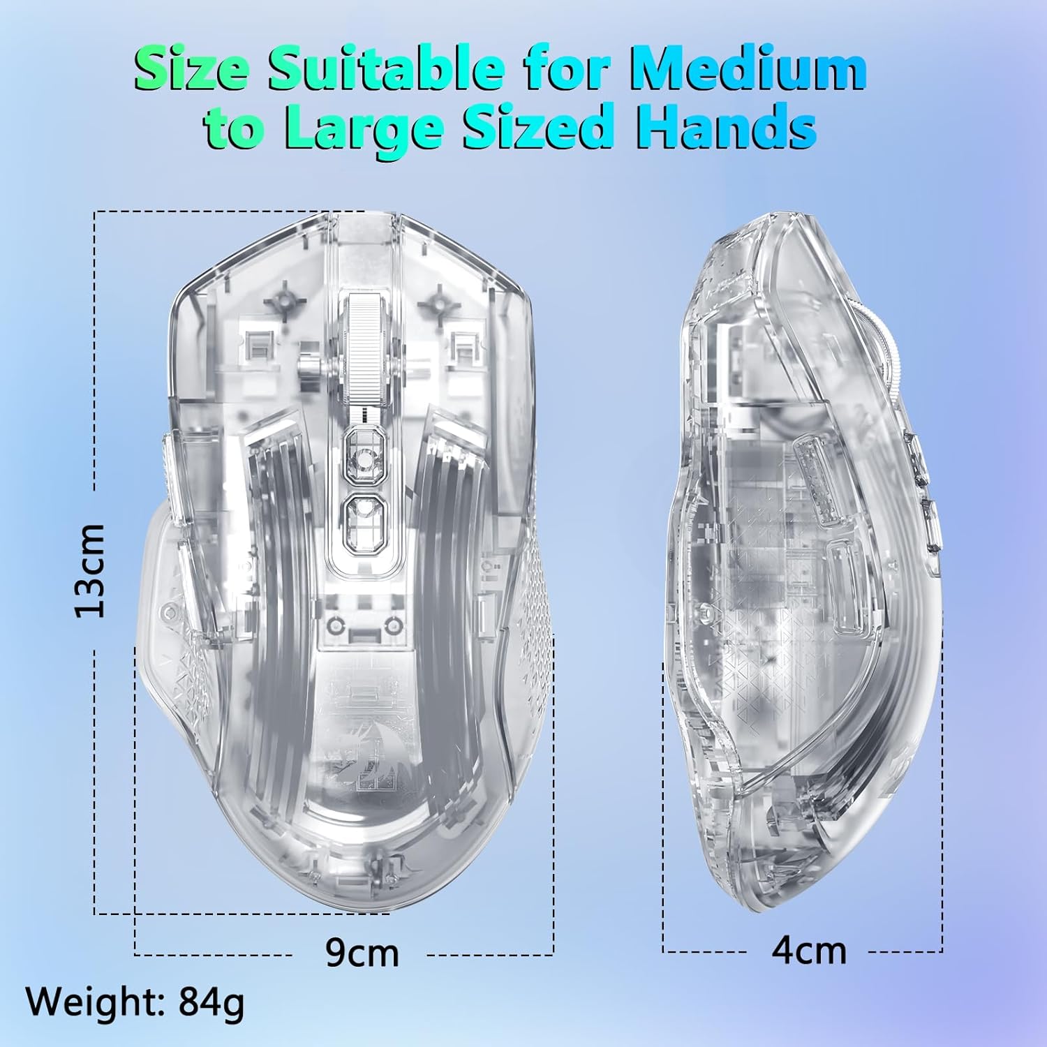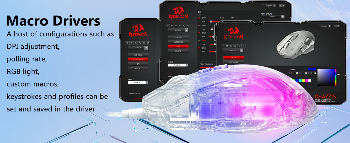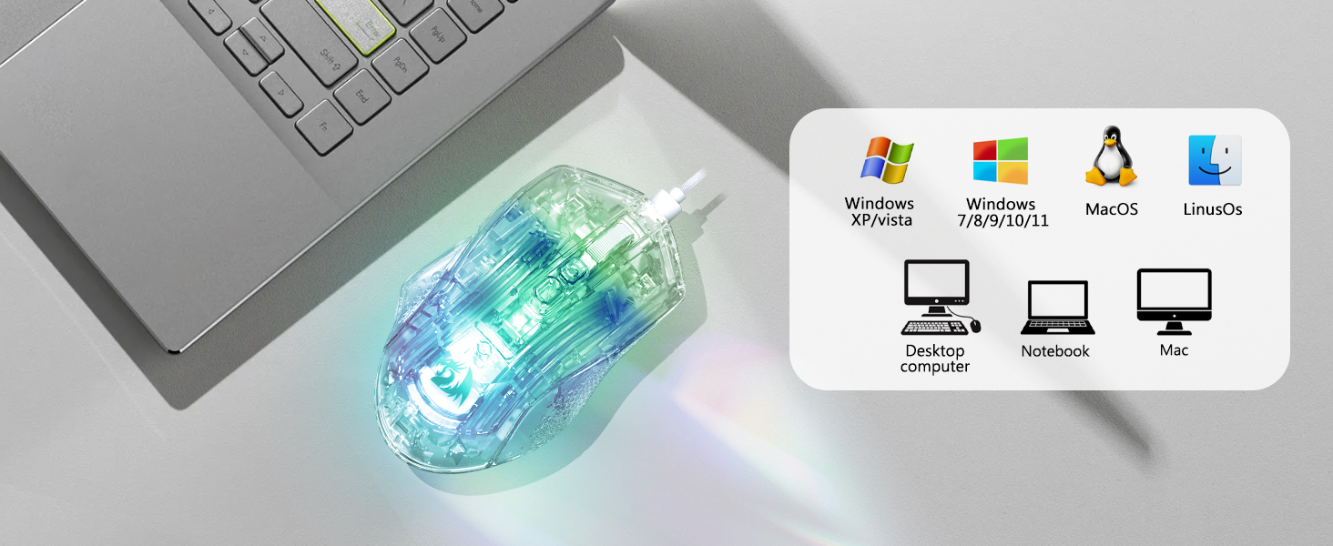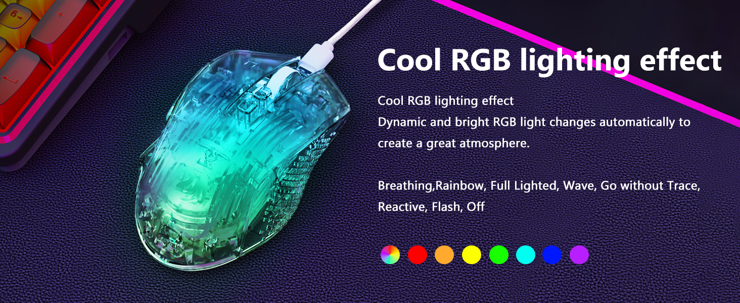 El mouse incluye ocho efectos de iluminación RGB que mejoran el atractivo visual sin afectar el rendimiento. Los usuarios pueden cambiar entre modos de iluminación para adaptarlos a su configuración o preferencias personales.