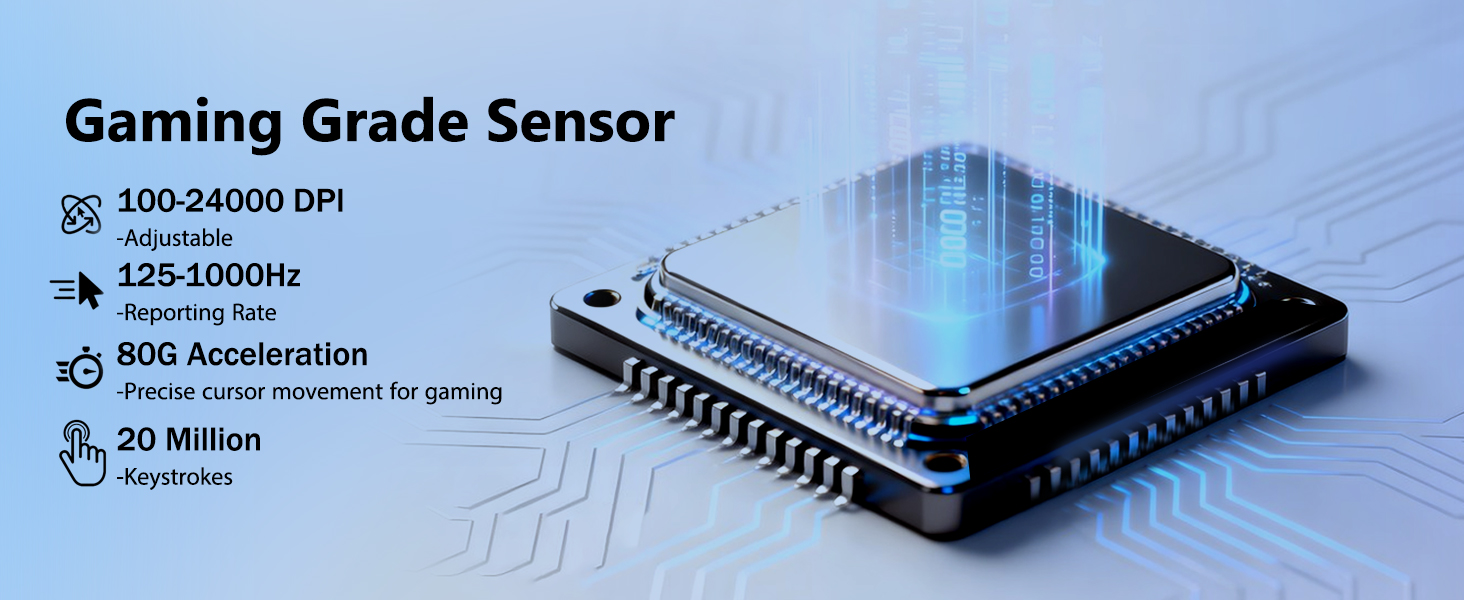 El mouse está equipado con un sensor óptico avanzado capaz de alcanzar hasta 24.000 DPI. Esto permite a los usuarios ajustar la sensibilidad según diferentes escenarios, desde objetivos precisos en juegos hasta movimientos rápidos del cursor en pantallas grandes.
